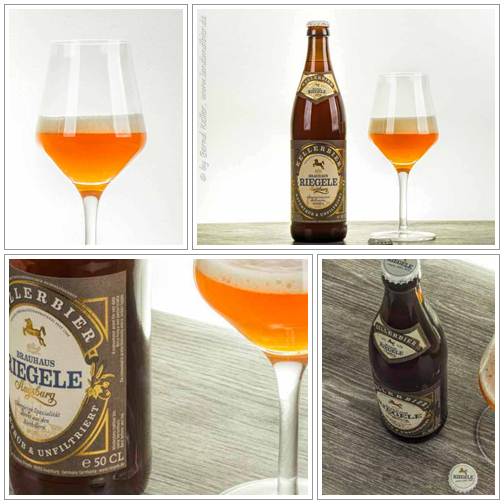 Das Riegele Kellerbier erscheint in der Linie der Traditionsbiere bei der Augsburger Brauerei. Kräftig und feinporig ist der weiße Schaum auf dem orangefarbenen, gleichmäßig trüben Kellerbier der Riegele Brauerei. Feine Kohlensäurebläschen steigen im orangefarbenen Bier auf, und während der Schaum sich langsam abbaut, steigt der komplexe Geruch auf. Es riecht deutlich nach Hefe-, und Malzaromen. Vage honigartige, süßliche Malzaromatik verbindet sich mit zitralen Südfrüchten, wie Orange und Mandarine. Gewürznelke und feines Bananenaroma strömen von der estrigen Seite hinzu und vermengen sich so zu einem fruchtigen, akzentuierten Kompott.